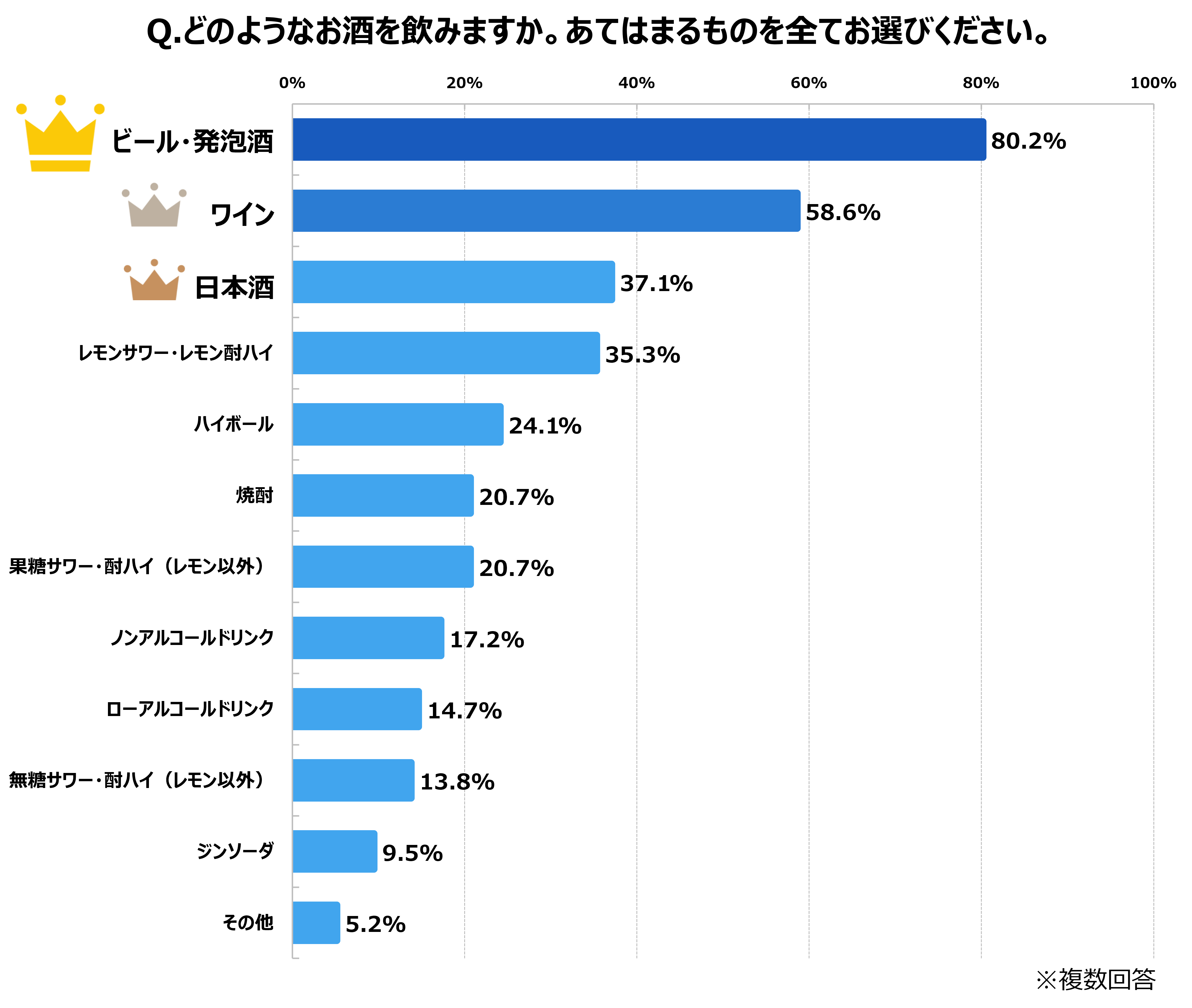 食事中に飲むお酒の種類については、1位ビール・発泡酒、2位ワイン、3位日本酒、4位サワー・酎ハイ、5位ハイボールと続いた。1位ビール・発泡酒は全体的な傾向と一致している。注目すべきは2位と3位のワインと日本酒で、同世代の男性層よりもワイン、日本酒を好む傾向が見られた。世代的にワイン、日本酒などになじみがある傾向や、炭酸系飲料が苦手など、この世代ならでは特徴があるのかもしれない。