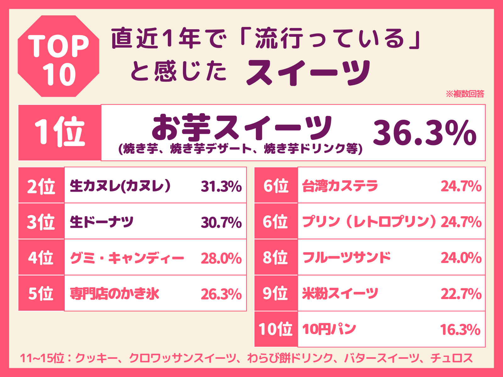 1位お芋スイーツ、2位生カヌレ(カヌレ)、3位生ドーナツ、4位グミ・キャンディー、5位専門店のかき氷となった。1位お芋スイーツ、2位生カヌレ(カヌレ)は2023年下半期と変わらずだったが、3位に生ドーナツが急上昇。4位グミ・キャンディー、5位専門店のかき氷と、グミ・キャンディー、かき氷など若年層のトレンドから幅広い年齢層に人気が広がっていることが確認できる。特にかき氷に関しては、調査の時期がやや早かったため5位となったが、夏に向けてこのかき氷トレンドは続くとみられる。さらに10位以下に、クルンジなどのクロワッサンスイーツ、チュロスと韓国発のスイーツもランキングに上がってきている。