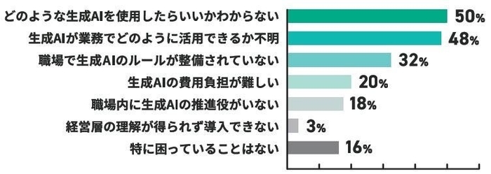 ・企業・事業主では、「生成AIが業務でどのように活用できるか不明」が50%、「職場で生成AIのルールが整備されていない」が44%。次いで、「どのような生成AIを使用すればよいか分からない」、「費用負担」などに課題