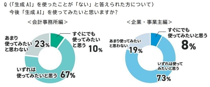 ➡会計事務所、企業・事業主ともに多くが将来的な生成AIの利用に前向きな姿勢