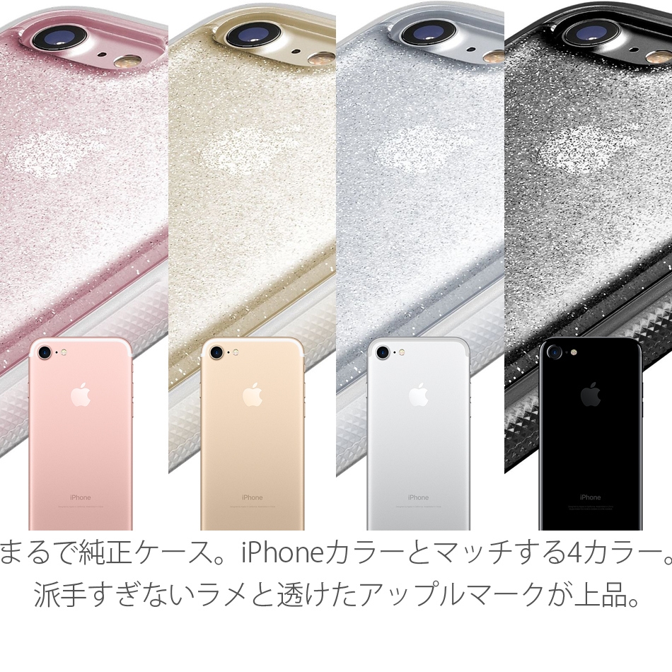 iPhoneのカラーに合わせて、ピンク、ゴールド、シルバー、ブラックの4色展開。上品にちりばめられたラメが、大人びた印象と共にかわいらしさを演出します。Appleのロゴが透けて見えるのもポイントです。