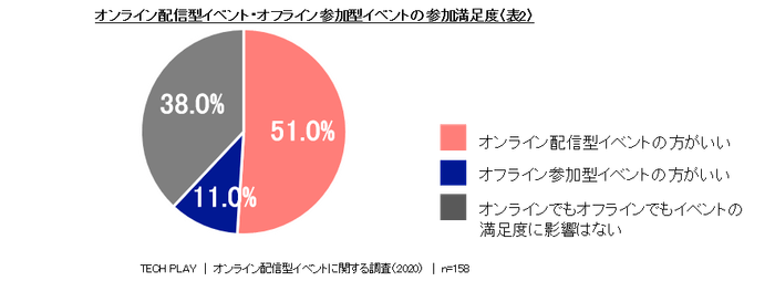 TECH PLAYのオンライン配信型イベントの参加者に「オンライン配信型イベント」と「オフライン参加型イベント」の満足度の違いについて質問したところ、参加者の51%が「オンライン配信型イベントの方がいい」と回答。
