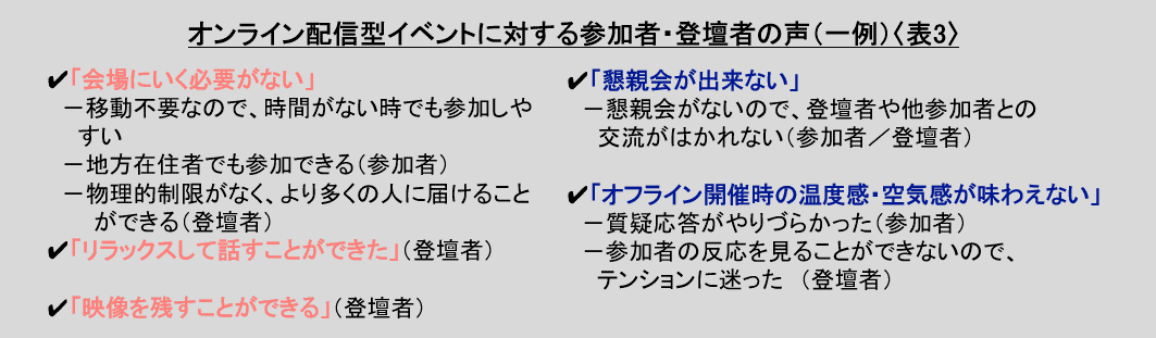 TECH PLAYのオンライン配信型イベントの参加者と登壇者の方々に感想、意見を聞いたところ、「会場に行く必要がない」という点で地方在住者を含めた参加しやすさや、より多くの人に届けることができるといった声が見受けられたほか、「リラックスできる」、「映像を残せる」と言った声がありました。一方で、「懇親会が出来ない」という点で登壇者や他の参加者との交流がはかれないという点や、「参加者の反応を直接見ることができない」といった声も寄せられました。 〈表3〉
