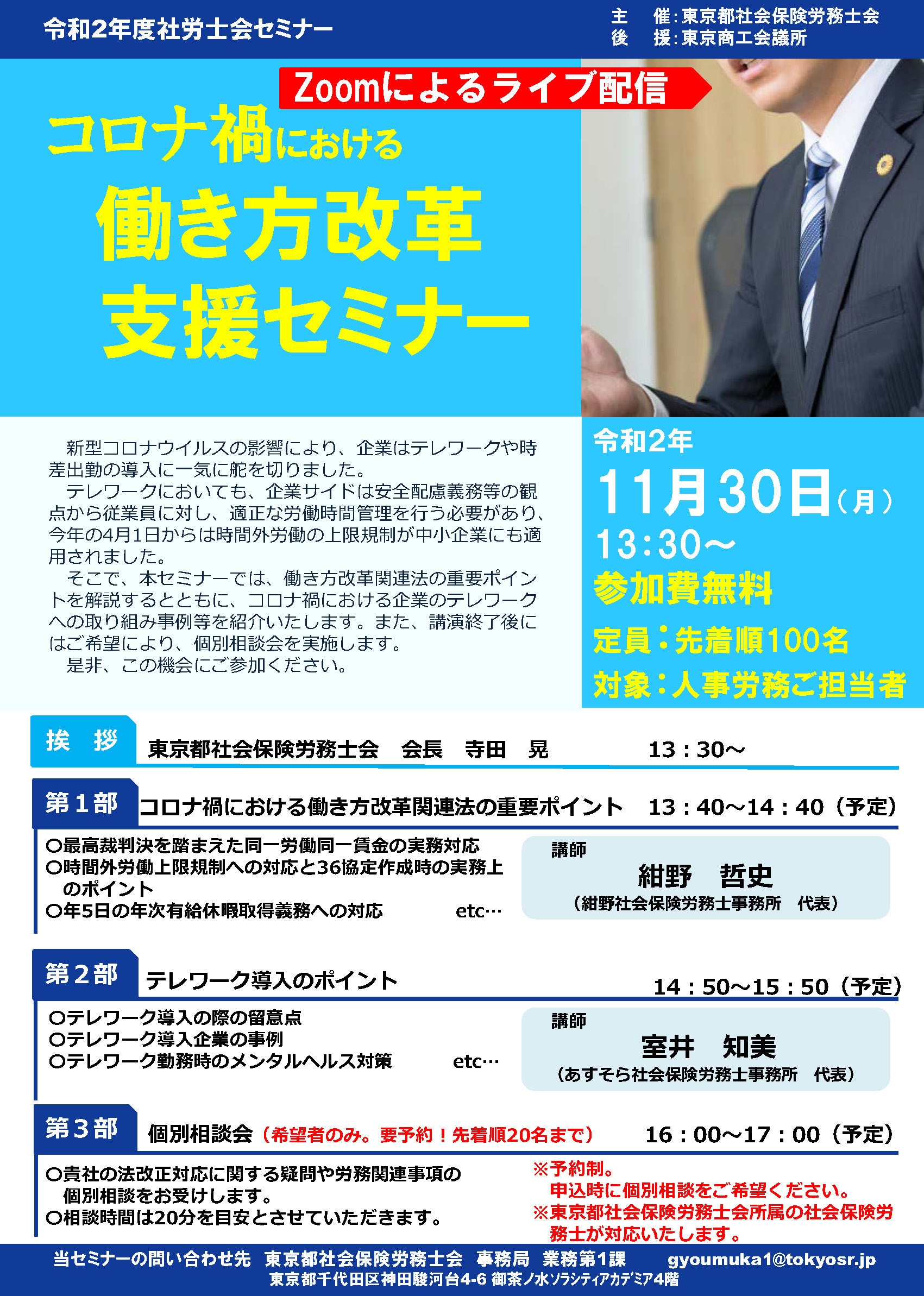 東京都社会保険労務士会(会長:寺田 晃)は、社会貢献事業の一環として、「コロナ禍における働き方改革支援」をテーマに無料セミナーを2020年11月30日(月)、オンラインで開催します。