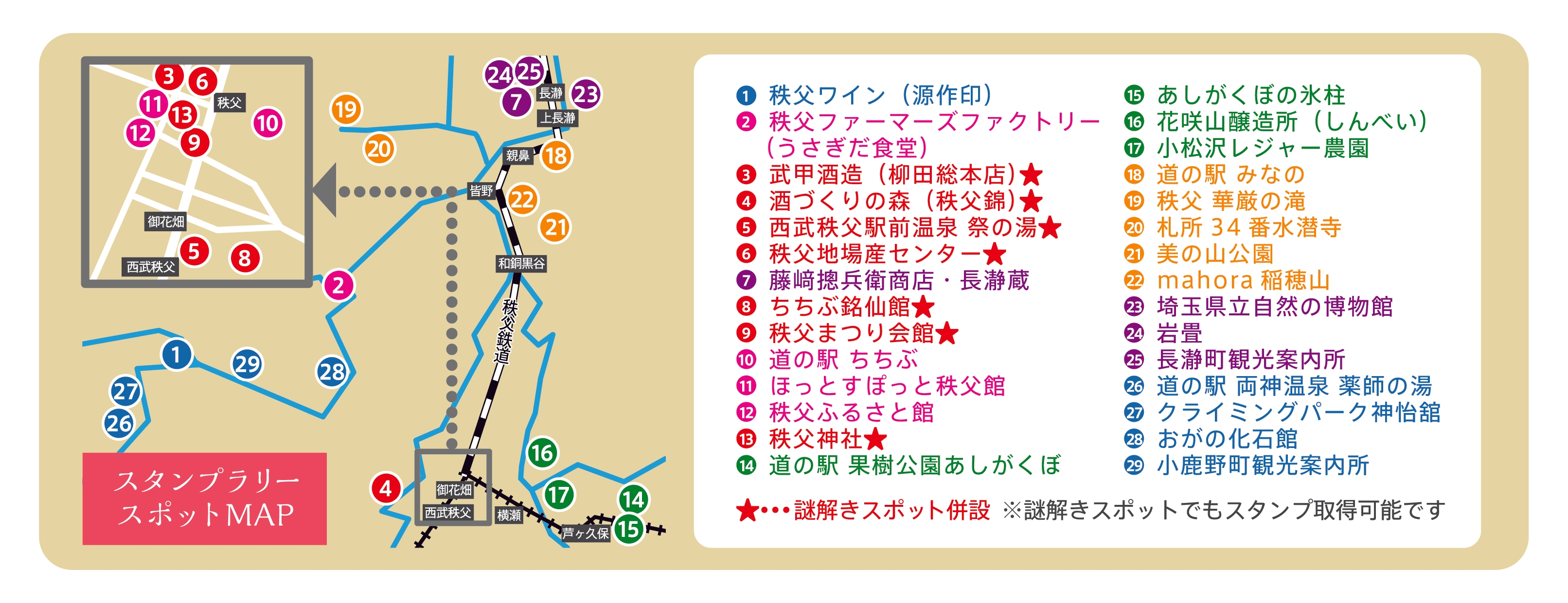 1市4町(秩父市、横瀬町、皆野町、長瀞町、小鹿野町)のスタンプを各1個ずつ計5個集めて応募すると、3千円分のコイン型商品券「和同開珎」が25名様に当たります。スタンプを3個集めて応募すると、千円分が50名様に当たり、スタンプを3個集めれば何度でも応募できます。さらに、「秩父謎解きトレジャーハント」と題して、秩父市内を観光しながら8つの難解な仕掛けをクリアして秘密の宝を見つける謎解きゲームも開催。全てを解決して応募すると、3千円分が50名様に当たります。