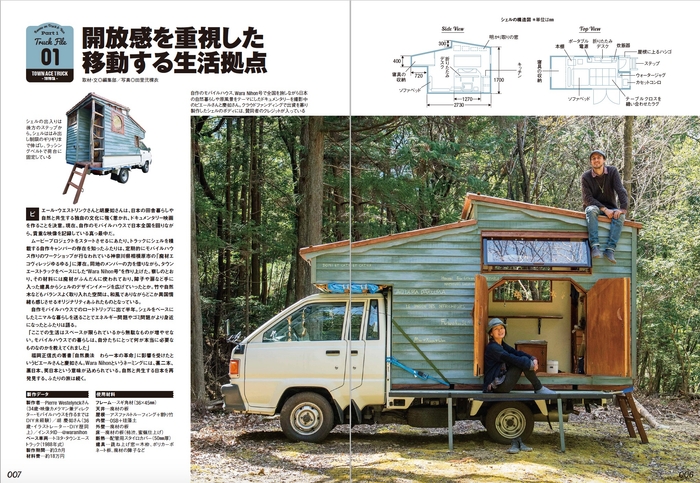巻頭の「手作りキャンピングカー実例集」では、DIYにより車中泊仕様に変身したトラックとバンを計16台紹介。