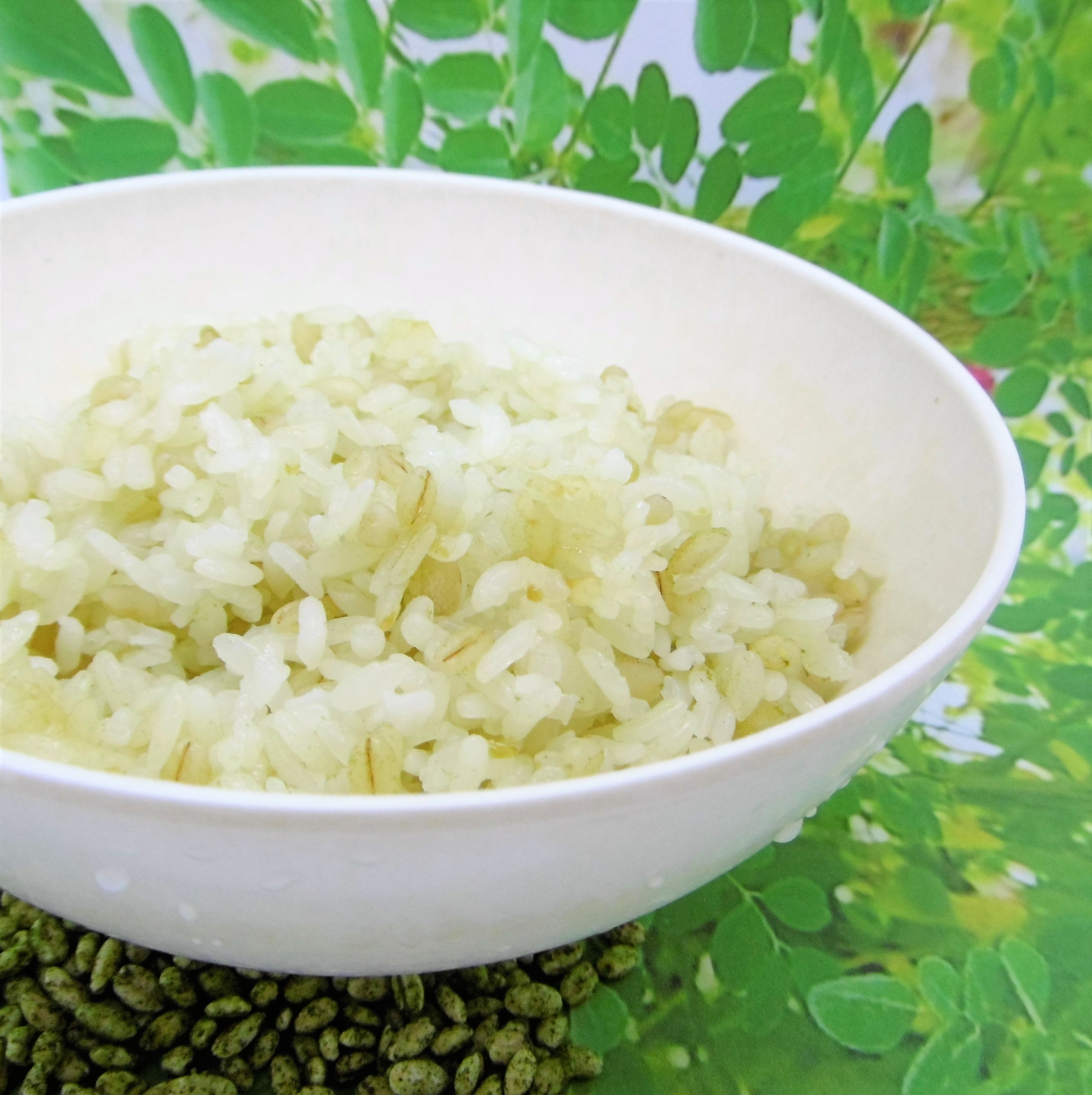 特許技術で食物繊維が豊富なもち麦をモリンガ粉末と有機緑茶粉末と腸活素材(機能性乳酸菌K-1・オリゴ糖)でコーティング加工したモリンガ乳酸菌もち麦です。