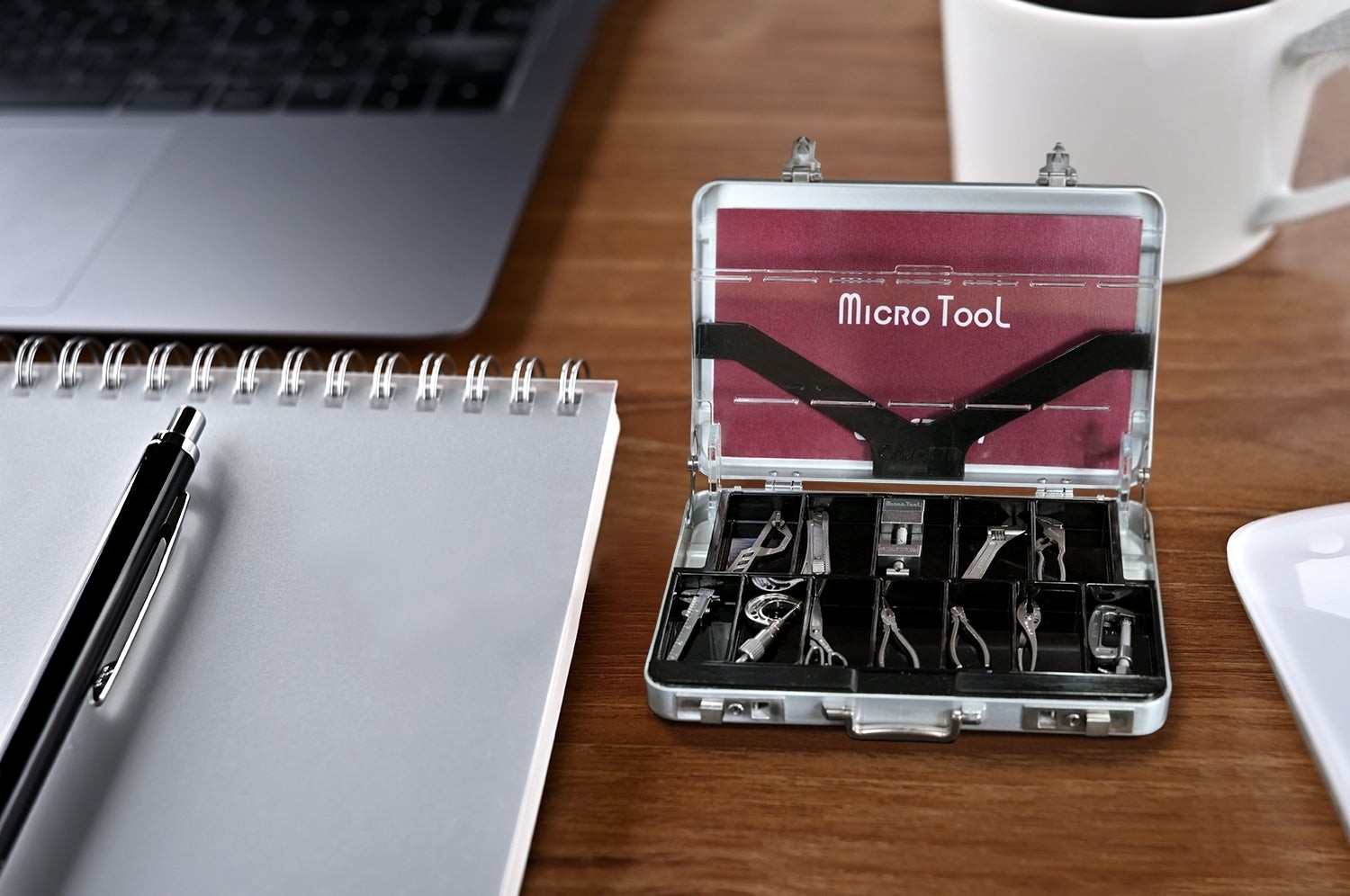 12種類のセットは高級感のあるアルミ製のアタッシュケース入りです。このアタッシュケースの細かな金属部品もミニ工具と同じ微細成形技術で製作されている為、品質にこだわっています。