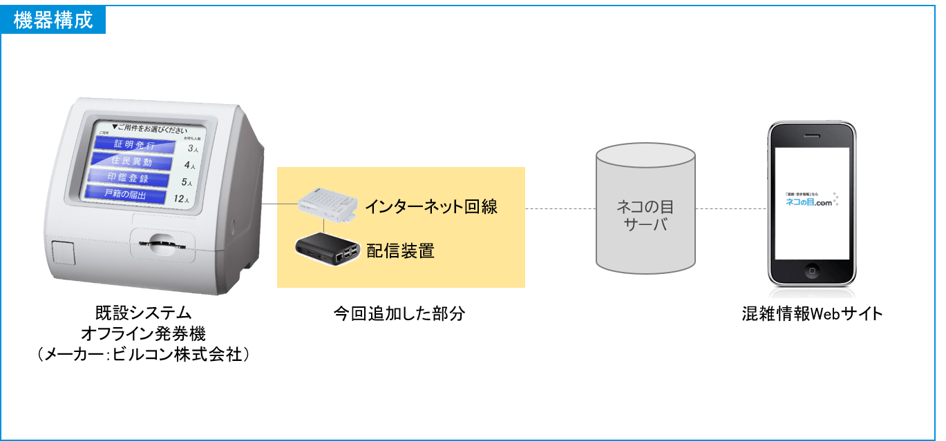 墨田区役所で現在使用している既存システム(オフラインの受付発券機)に対し、インターネット回線と配信装置を取り付けオンライン化し、受付発券機の情報を混雑状況としてWebサイト上にリアルタイムに配信します。