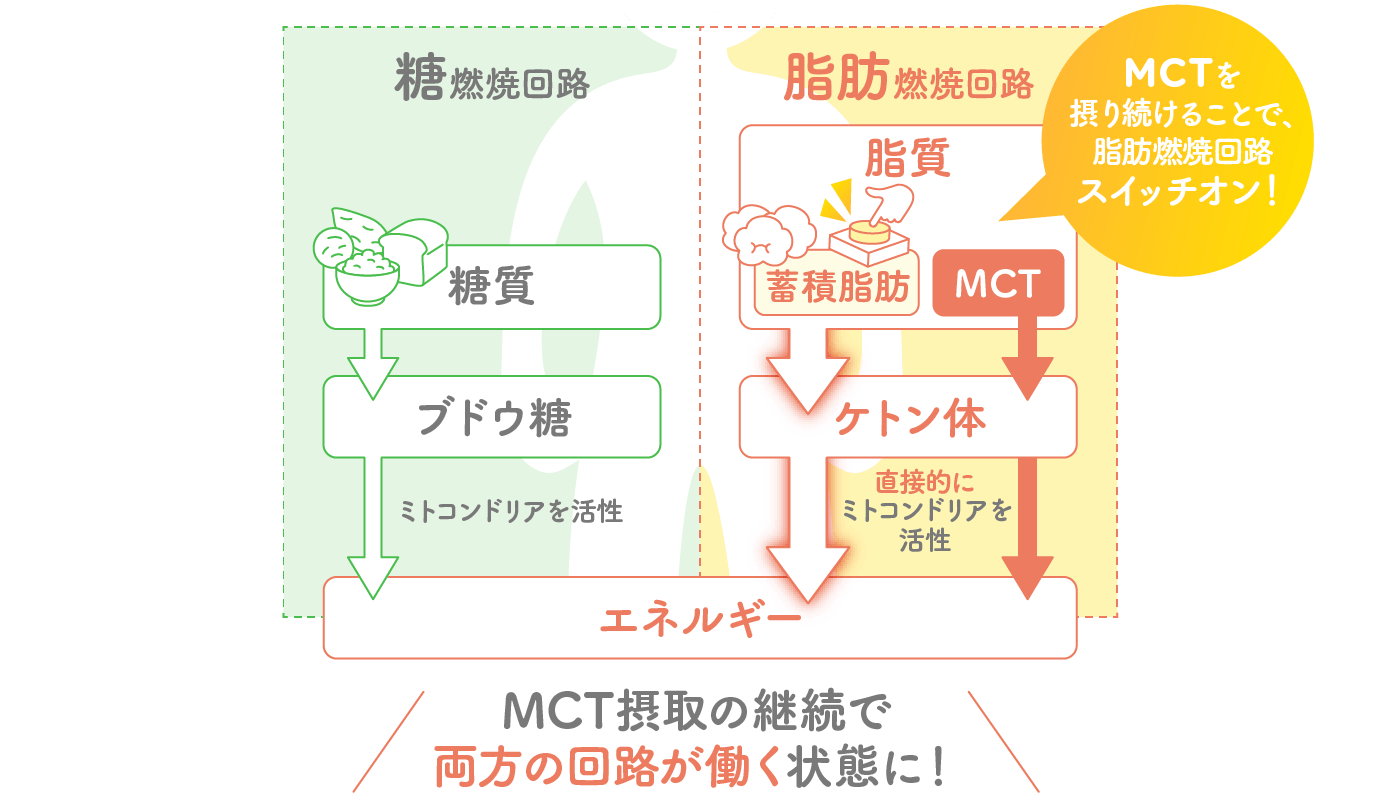 MCTとは中鎖脂肪酸(Medium Chain Triglyceride)のことで、母乳や牛乳などの乳製品、さらにはココナッツなどのヤシ科植物の種実に含まれる成分です。食用油に含まれる脂肪酸の中では、一般的な油である長鎖脂肪酸(Long Chain Triglyceride:LCT)などと比べて、約4倍も素早く消化・吸収され、エネルギーになりやすい特長があります。脂質や脂肪が燃焼されると、ケトン体というエネルギー源に変わります。私たちのカラダは「糖」と「脂肪」の2つをエネルギー源にしていますが、ほとんどが「糖」をエネルギー源とする「糖燃焼回路」を使っています。