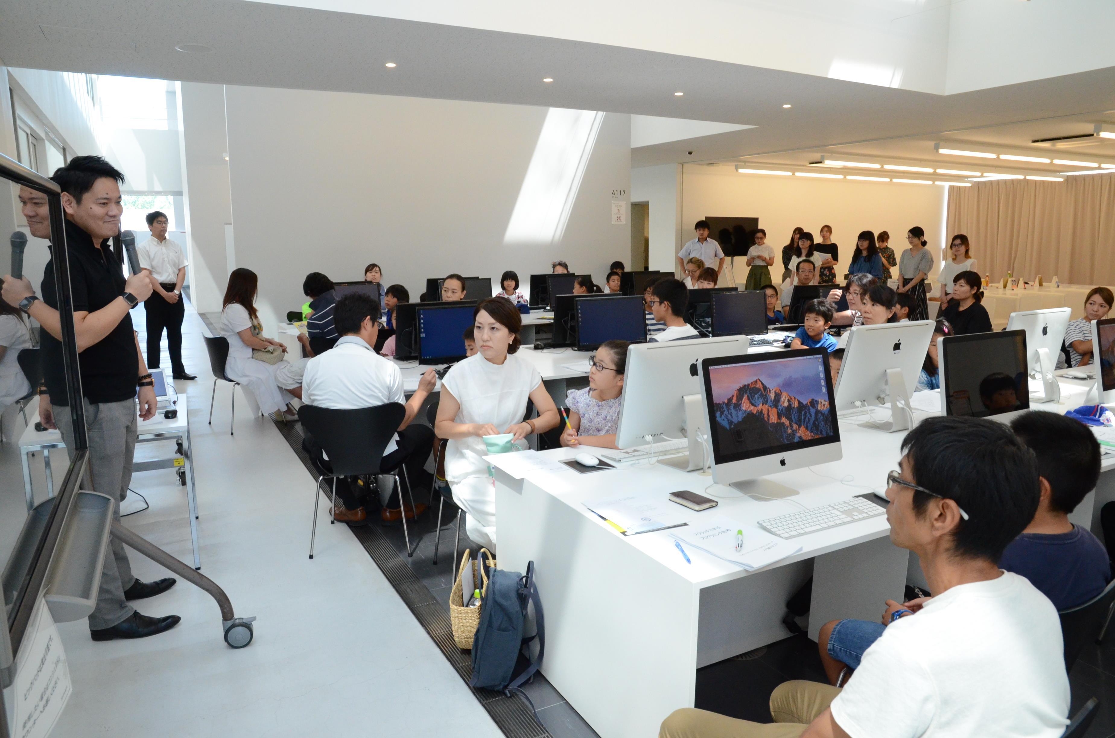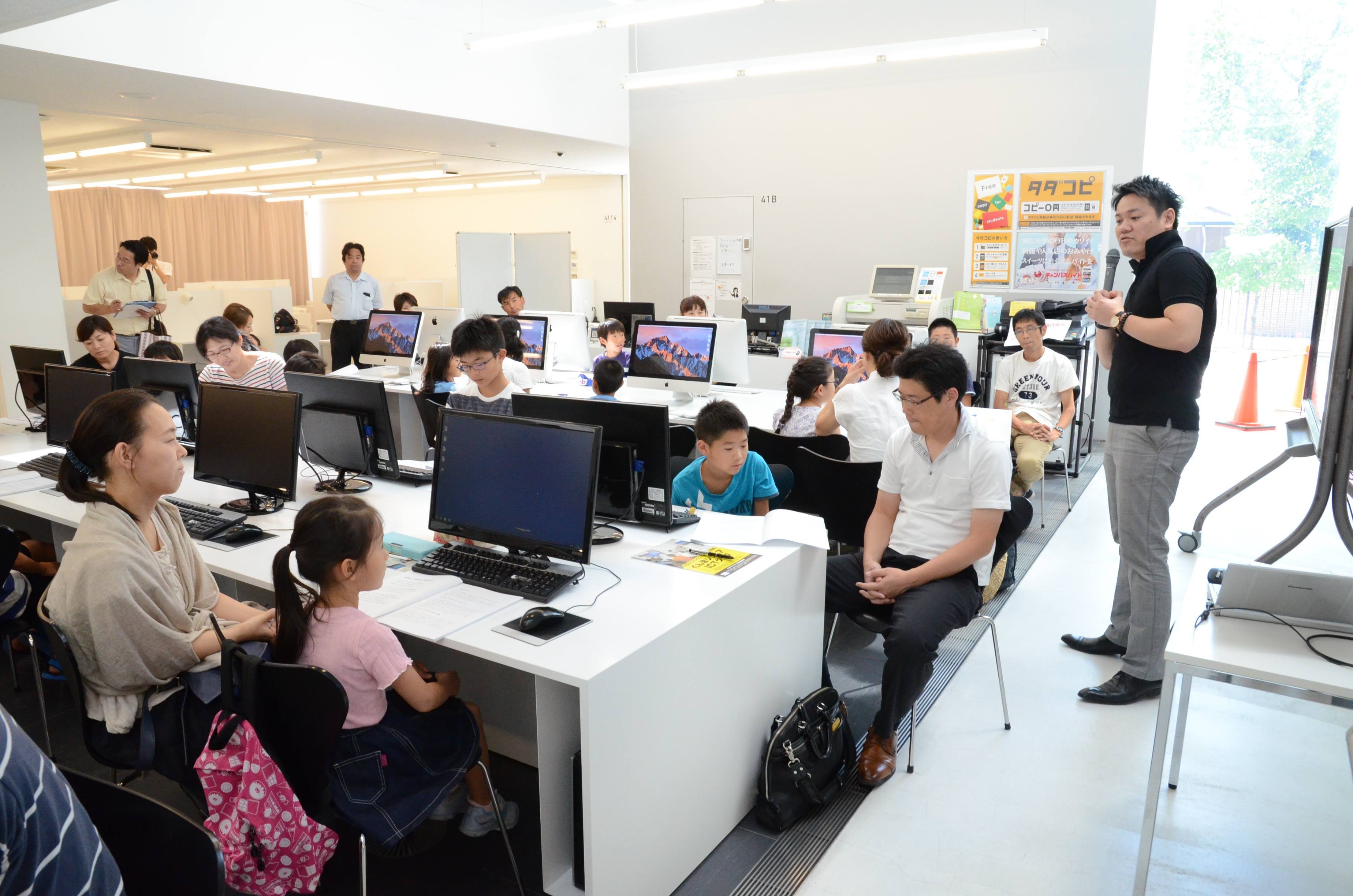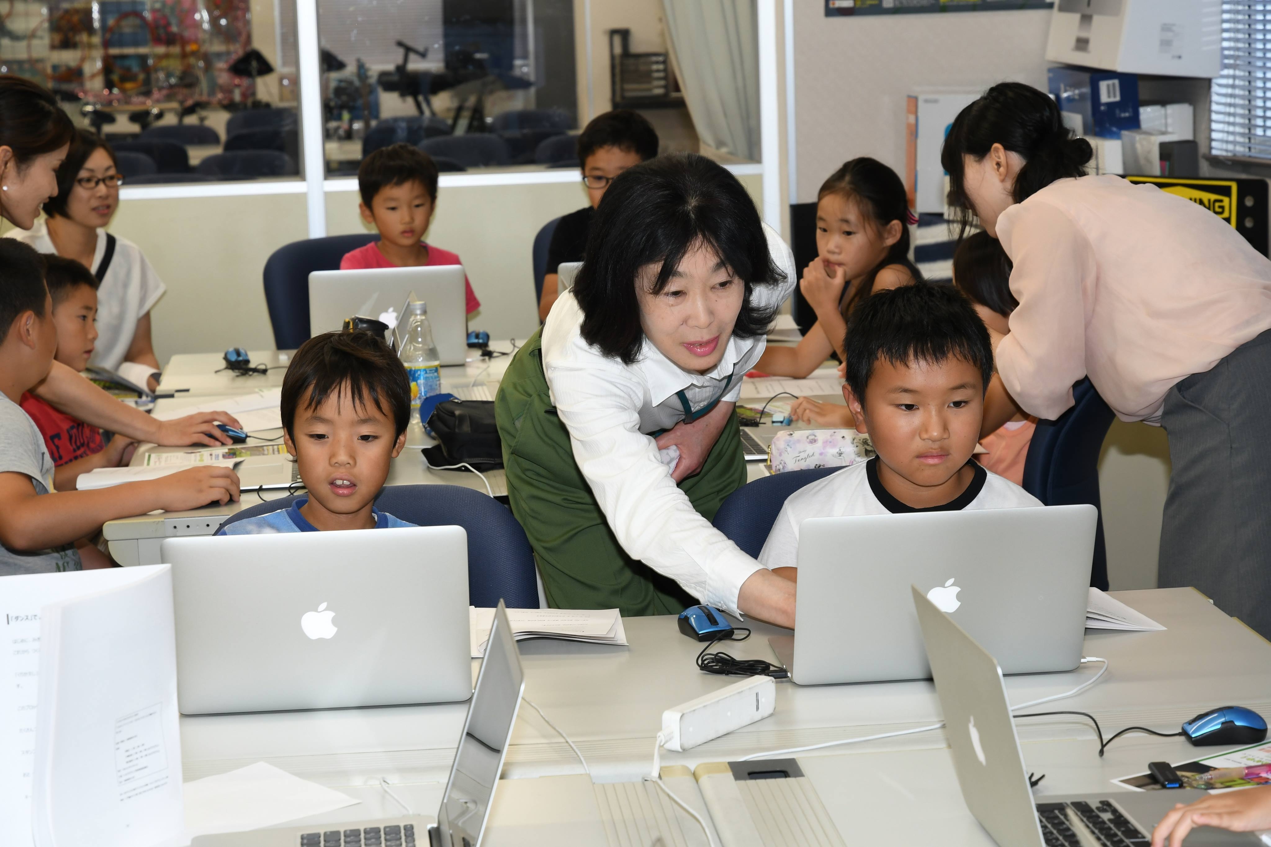 スクールではプログラミングの基礎を学ぶソフト「スクラッチ」を使用。基礎編では、参加者はパソコンの扱い方からキャラクターの動かし方まで、講師や学生メンターから分かりやすく指導を受けました。基礎編終了者を対象にした応用編は、でき上がったキャラクターで簡単なゲームを作るなどレベルアップした内容で、参加者はプログラミングの魅力を再認識していました。