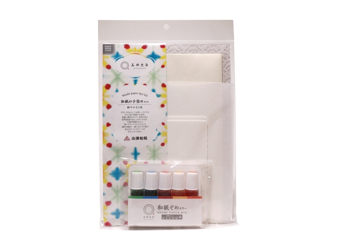 お子様から大人の方まで、日本の伝統的な和紙を存分に使いながら、和紙の手染めをすぐに楽しむことができるセット商品になっており、染色技法やオリジナル作品の作り方、伝統的な和紙の解説も同梱されています。英語併記のため、海外からの観光客の体験ニーズやお土産などにも最適です。