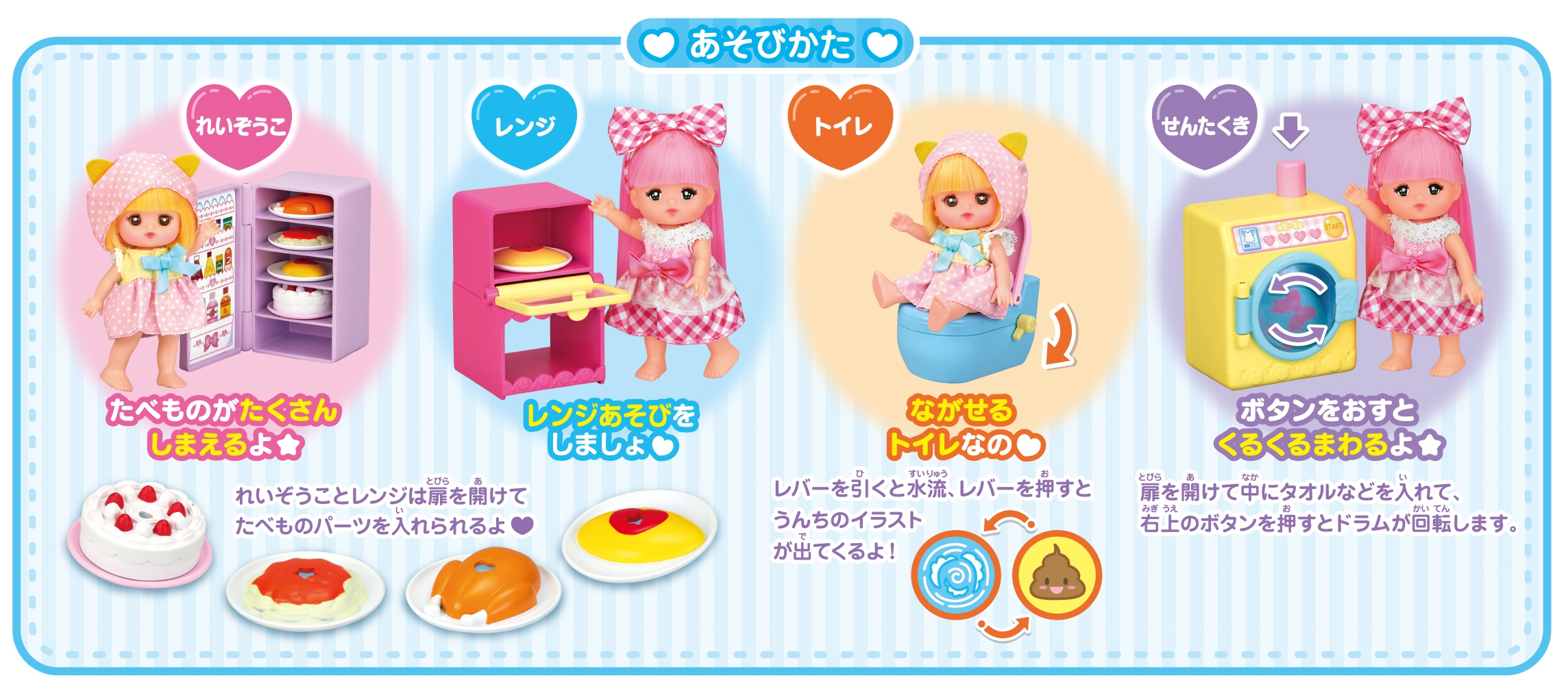 洗濯機はボタンを押すとドラムがくるくると回転します。トイレは、レバーを引くと水流、レバーを押すとうんちのイラストが出ます。本物そっくりの家具セットで、ポケットメルちゃんとたくさん遊んでみてください。