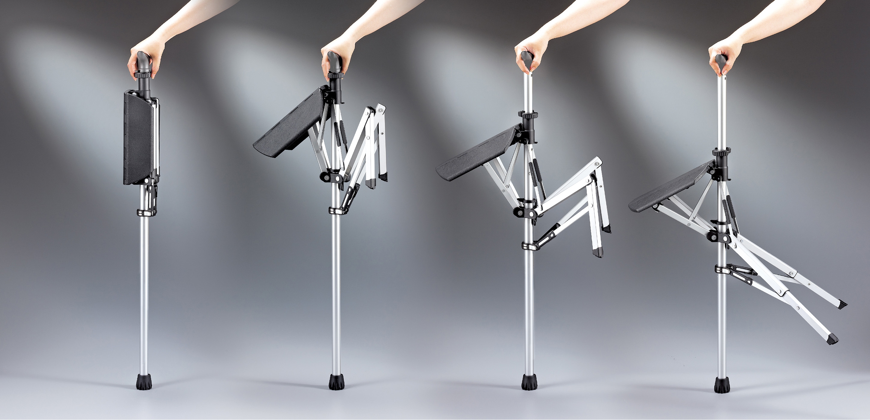 ワンタッチで杖から椅子になるアクティブシニア向け商品が登場! 握りやすいグリップと立ち座りしやすい座面を搭載