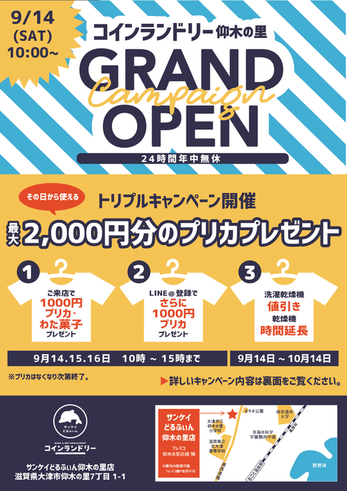 三恵観光株式会社(本社:京都府福知山市、代表取締役:杉本 潤明)は、7店舗目となる地域密着型コインランドリー『サンケイどるふぃん』を、2019年9月14日(土)、滋賀県大津市仰木の里にグランドオープンいたします。