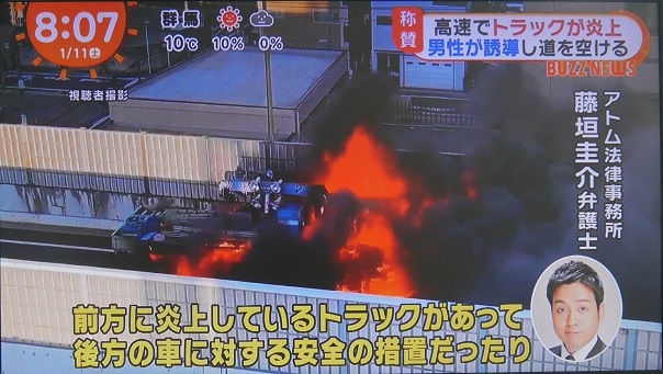 1月11日、フジテレビ・めざましどようびで高速道路での火災時における誘導行為について弁護士が解説しました。