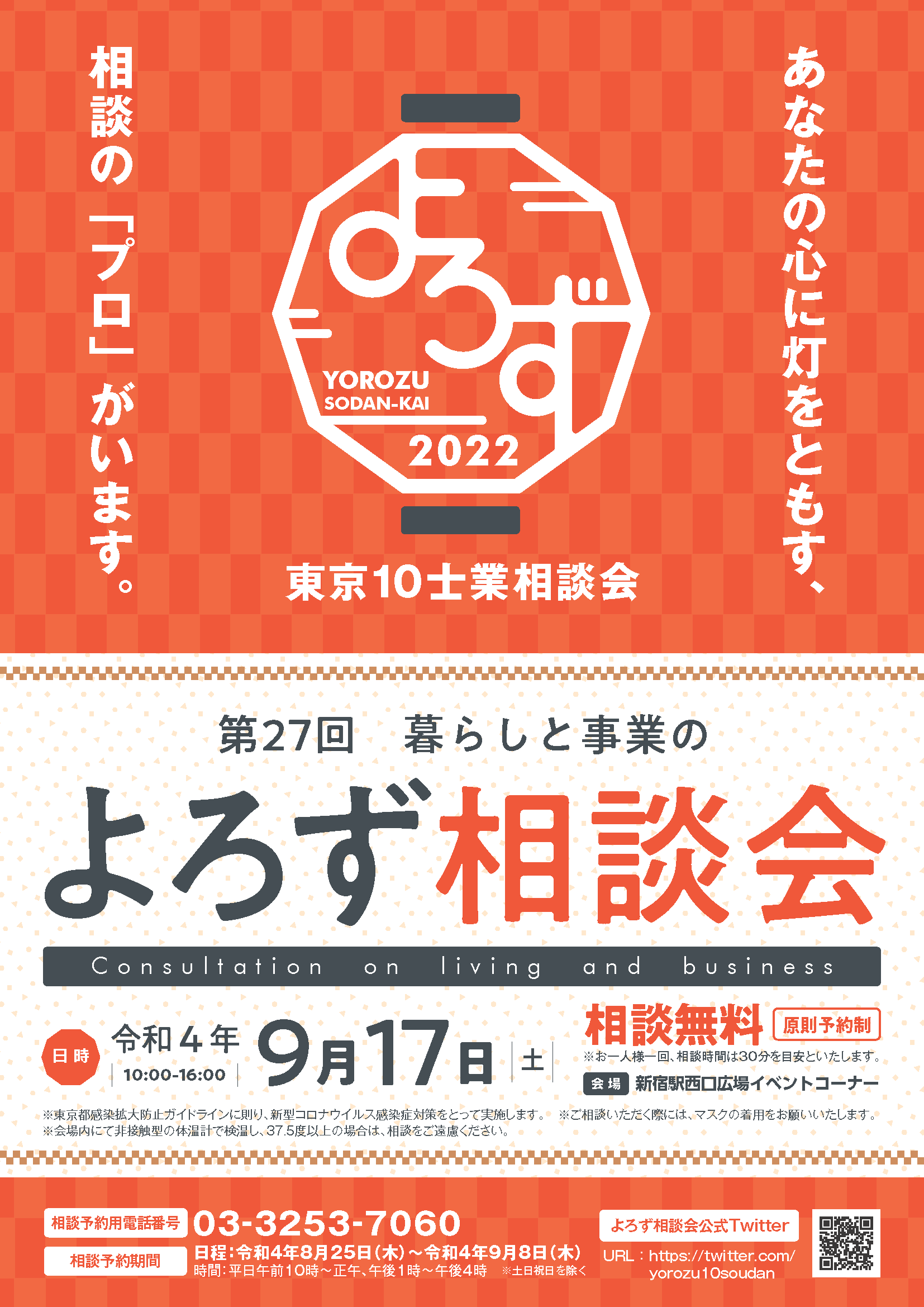東京10士業よろず相談会実行委員会(幹事会:東京都社会保険労務士会)は、東京の10士業・13団体が無料で応じる相談会「第27回 東京10士業 暮らしと事業のよろず相談会」を令和4年9月17日(土)に宿駅西口広場イベントコーナーで開催いたします。