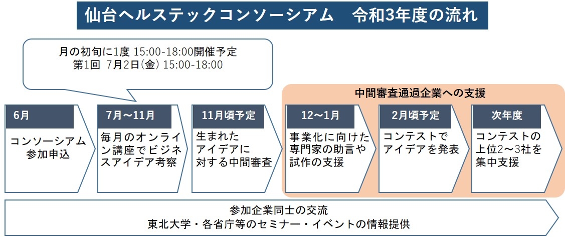 令和3年度は、ヘルスケア領域の事業に関心のある企業・組織が幅広く参加できる学びの場、思考の場、企業間のマッチングや情報交換の場として「仙台ヘルステックコンソーシアム」を新たに設立する。参加者の共創によるビジネスの創出を目指し、ヘルスケア領域での事業創出を目指す企業に参加を呼びかけている。
