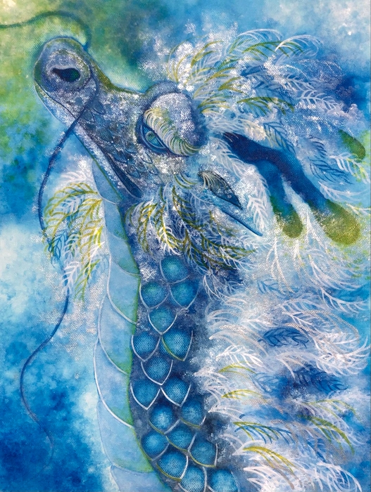 2024年は辰年ということで、「龍の絵」のオーダーを前年に得ていた亜紗美さんは、龍神を描くという恐怖(プレッシャー)に固まっていました。創作には、根本にあった虐待へのトラウマからの解放がカギになると考え、一年間自らのトラウマと向き合ってきました。そして周囲の人たちの温かさに触れながら、静かに変化をしていった体感を作品に表現しました。