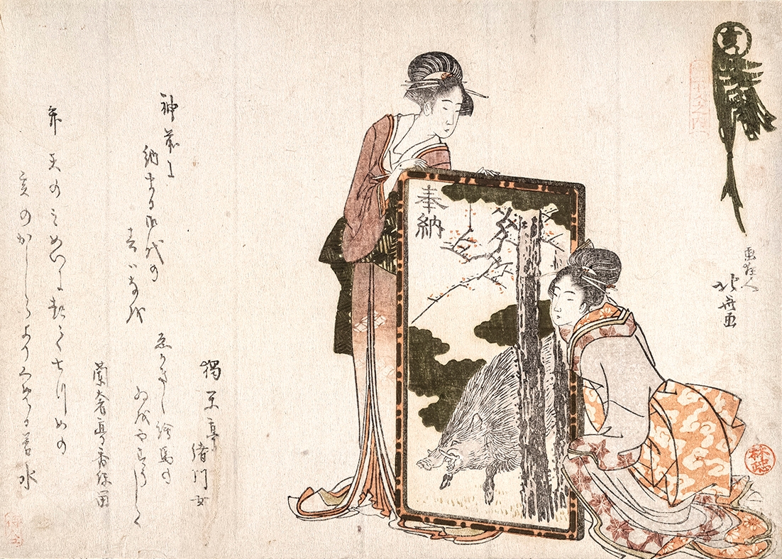 北斎が絵を手がけた享和3年(1803)初春の摺物。薫は「蘭奢亭香保留」として、春興の狂歌を添えている。売り物ではなく、私的に出資して作られる摺物は豪華なものが多く、ここでも金彩が用いられている。美術商として知られる林忠正旧蔵品。