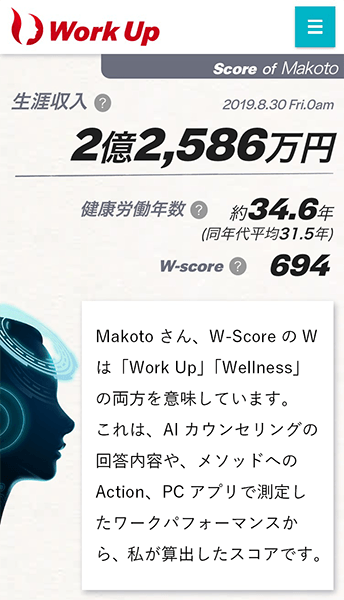 利用者の現在の仕事のパフォーマンスや食生活や生活習慣のカウンセリングを通して、健康偏差値や余命、健康労働年数、残りの一生での収入などの予想をAIがシミュレーションして表示します。
