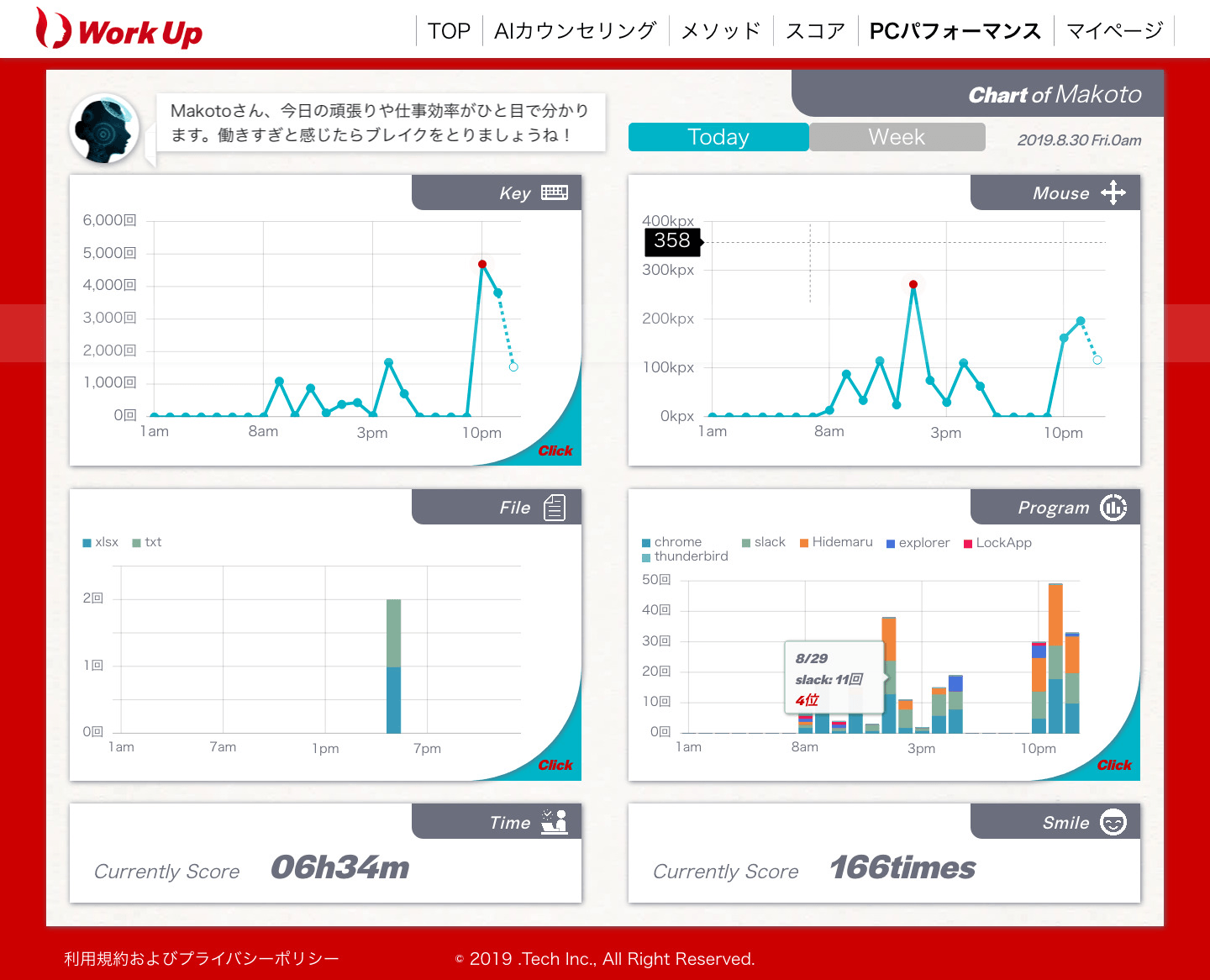 専用のPCアプリをインストールすることで、毎分、毎時間のパソコンでのワークパフォーマンス、パソコンを前にしている時間やその時の顔の表情などを自動測定します。(特許出願中)