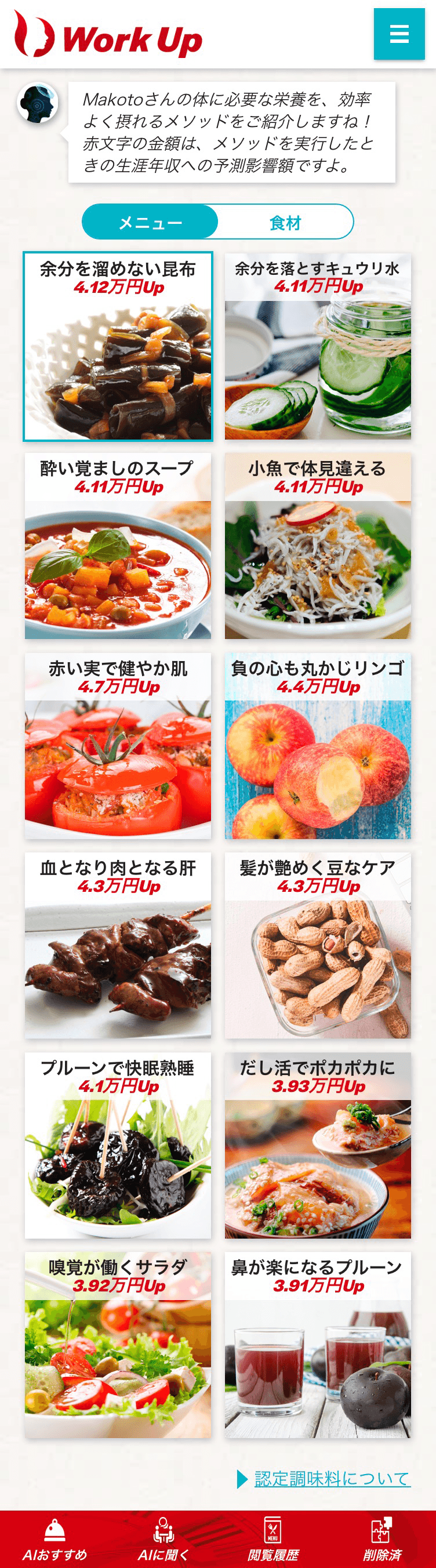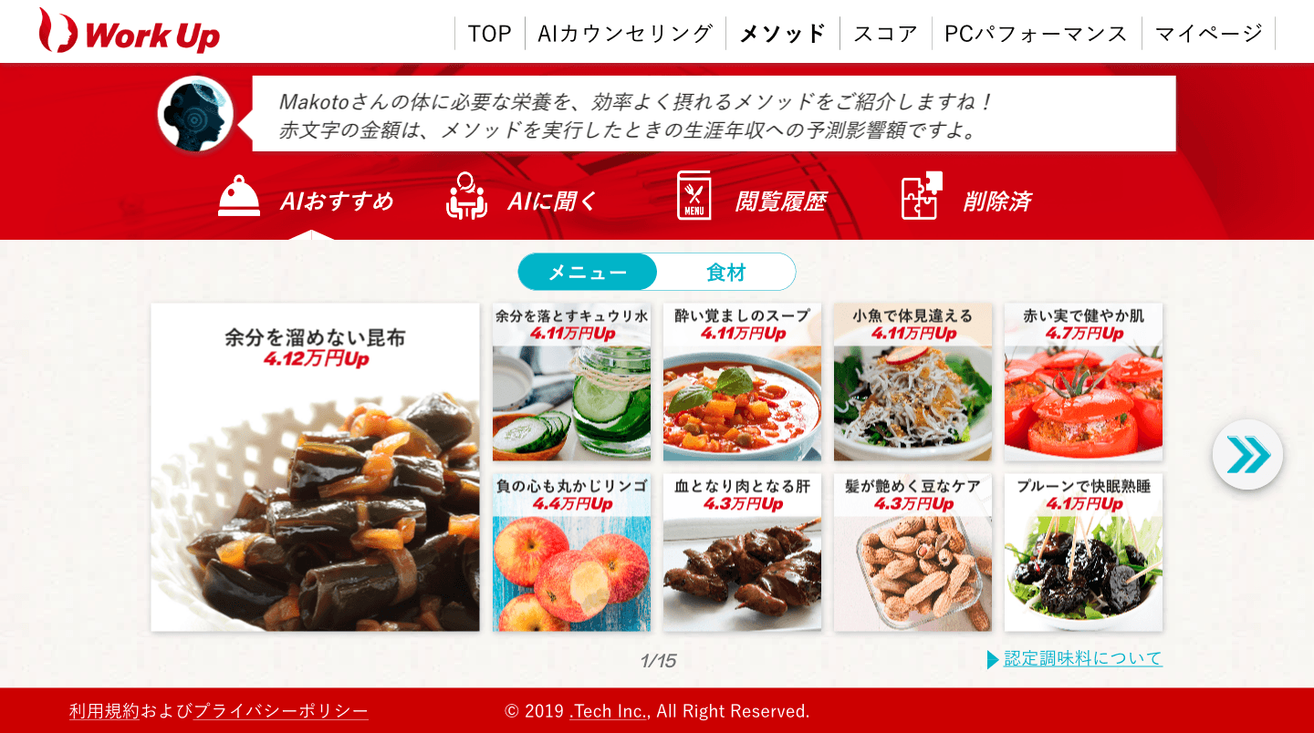 利用者が行っていない食生活や生活習慣のうち、年収の向上につながるような改善方法をAIが選別して勧めます。また、生涯収入シミュレーションで、ディープラーニングにより算出された年収の向上金額を各メソッドに表示します。メソッドはシグナルトークが保有する自社健康アプリ会員の回答データ、別途の統計調査データなどのべ3,500名のデータと、食事と生活改善についての約50万通りの組合わせデータの中から、ディープラーニングと統計手法を駆使してAIがお勧めします。