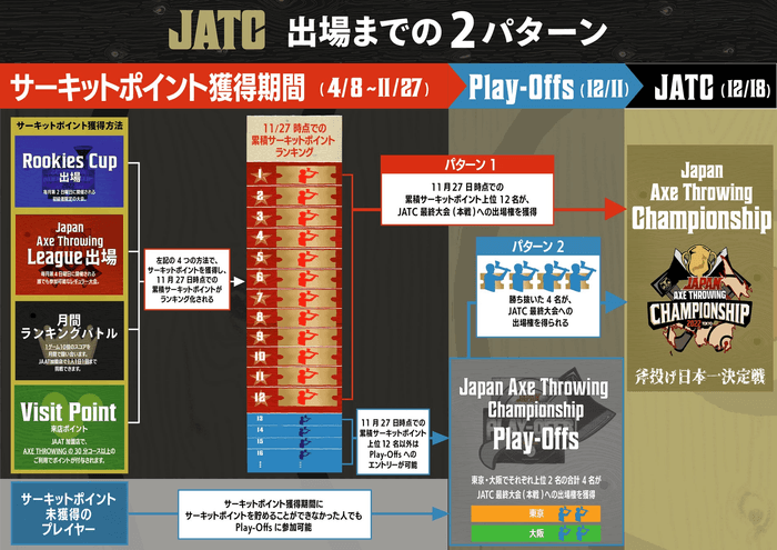 *サーキットポイントとは、最終大会(本戦)に出場する12名を決定するために用いる指標のことで、参加者はJAAT主催の予選大会等で貯めることが可能となります。