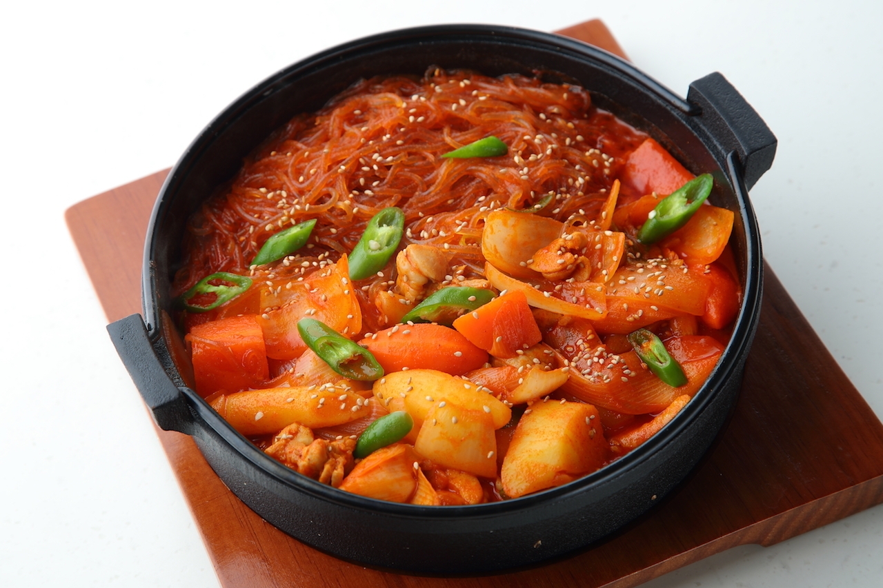 韓国語で「蒸し鶏」という意味で、醤油ベースのタレで煮込んだ鶏肉料理です。鶏と野菜のうまみを存分に楽しめる煮込み料理で、「タンミョン」とよばれる韓国の春雨もアクセントになっています。