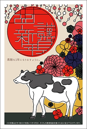 制作者コメント: 来年は丑年なので牛をモチーフとしたイラストにし、黒と白を基調とした年賀状にしました。