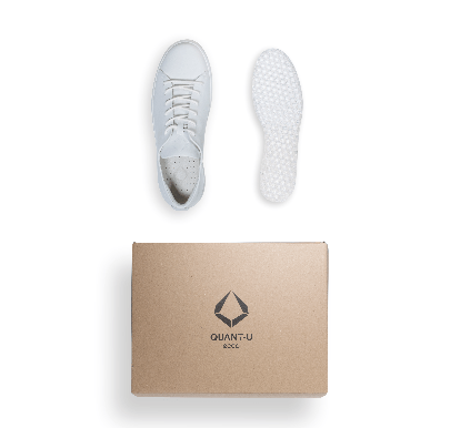 『QUANT-U』は3D足型計測、計測結果をもとにその人のためにデザインされるシリコーン製ミッドソール制作、カスタマイズされたミッドソールを装着する専用のシューズ3つセットで合計76,000円(税抜)*で販売します。