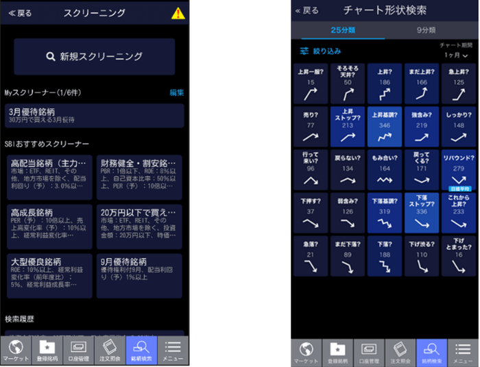 銘柄スクリーニング機能では、PERなどの財務情報やテクニカル指標などの条件で銘柄を検索することが可能です。チャート形状検索機能では、チャートの形状により25パターンまたは9パターンで銘柄を検索することが可能です。