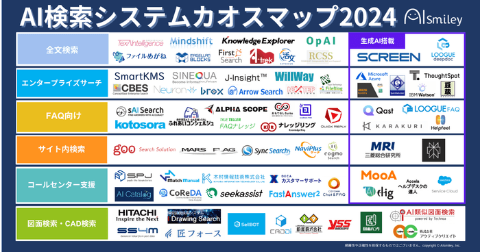 ※このカオスマップはAI検索システム提供企業のプレスリリースや製品オフィシャルサイト、導入実績などの公開情報を基にAIsmiley編集部が独自の主点で取りまとめたもので、網羅性や正確性を完全に担保するものではありません。