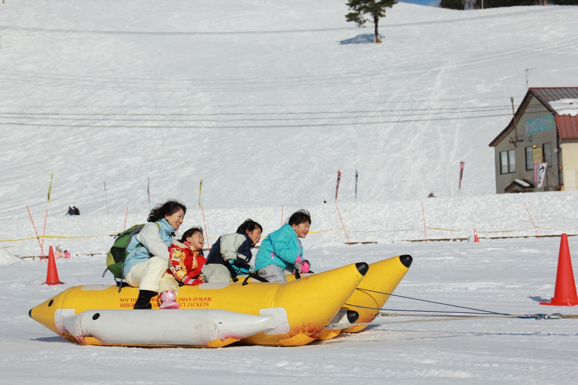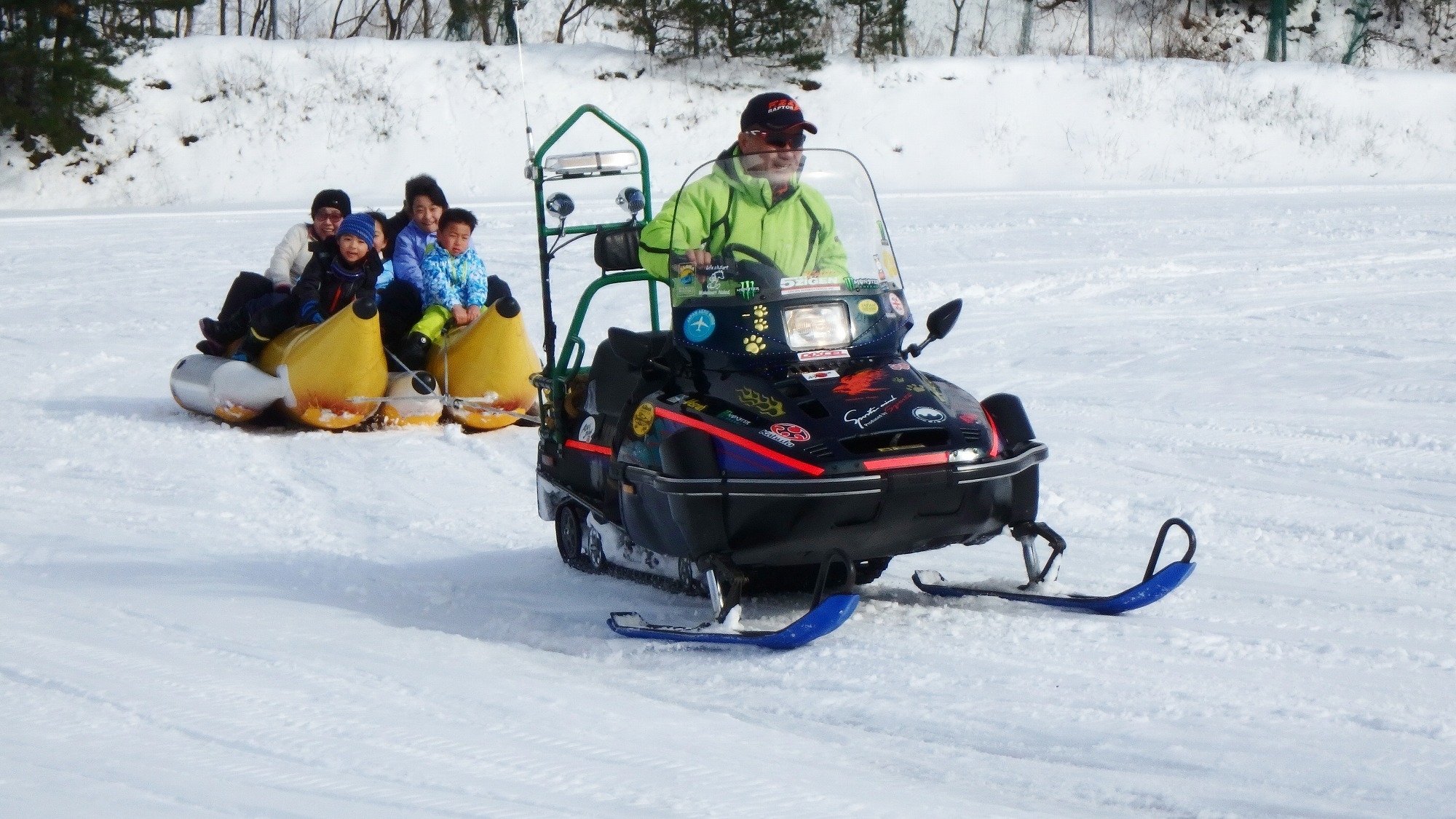 専門のインストラクターが運転するスノーモービルが牽引するスノーボート(バナナボート)に乗って雪原をスリル満点に走行します。飛び跳ねたり、回ったりするボートの上で家族一緒にお楽しみいただけます。