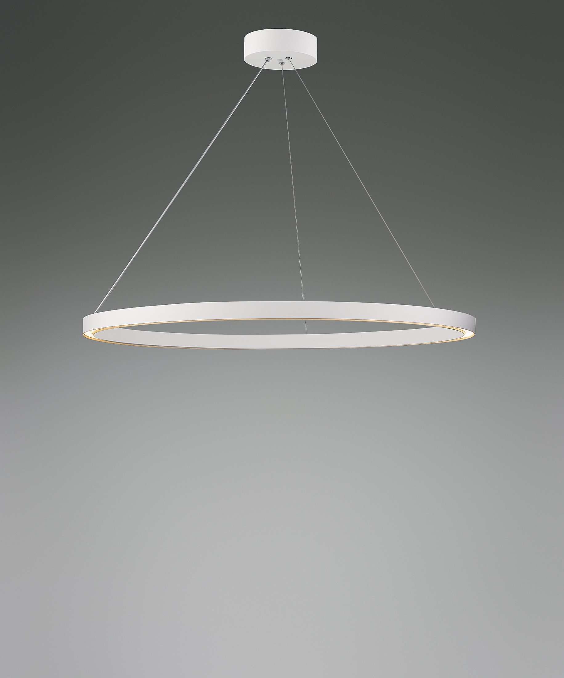 シンプルなデザインとクオリティを追求したリング型調光シャンデリア。発光面は、灯具内部の粒感を隠す為にシリコン素材を使用し、眩しさを感じにくいフラットな「光の輪」を実現しました。発光面の側面は、テーパーを施し、ソリッドでシャープな印象を与えるデザインとなっております。3サイズ展開で(Φ1000/Φ800/Φ600)空間のボリュームに合わせてサイズをお選び頂けます。また色温度は、3色展開で(2700K 電球色/3500K 温白色/5000K 昼白色)専用調光器を設ければ100%~約1%まで調光が可能です。電源線自体が吊具として機能するように工夫し、フランジ部分のデザインもシンプルにする事で灯具を引き立たせ、空間の邪魔をしない設計となっております。