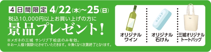 4/22(木)~4/25(日)の4日間限定で、税込10,000円以上お買い上げの方に、ミキオリジナル景品をプレゼントいたします!※無くなり次第終了となります。