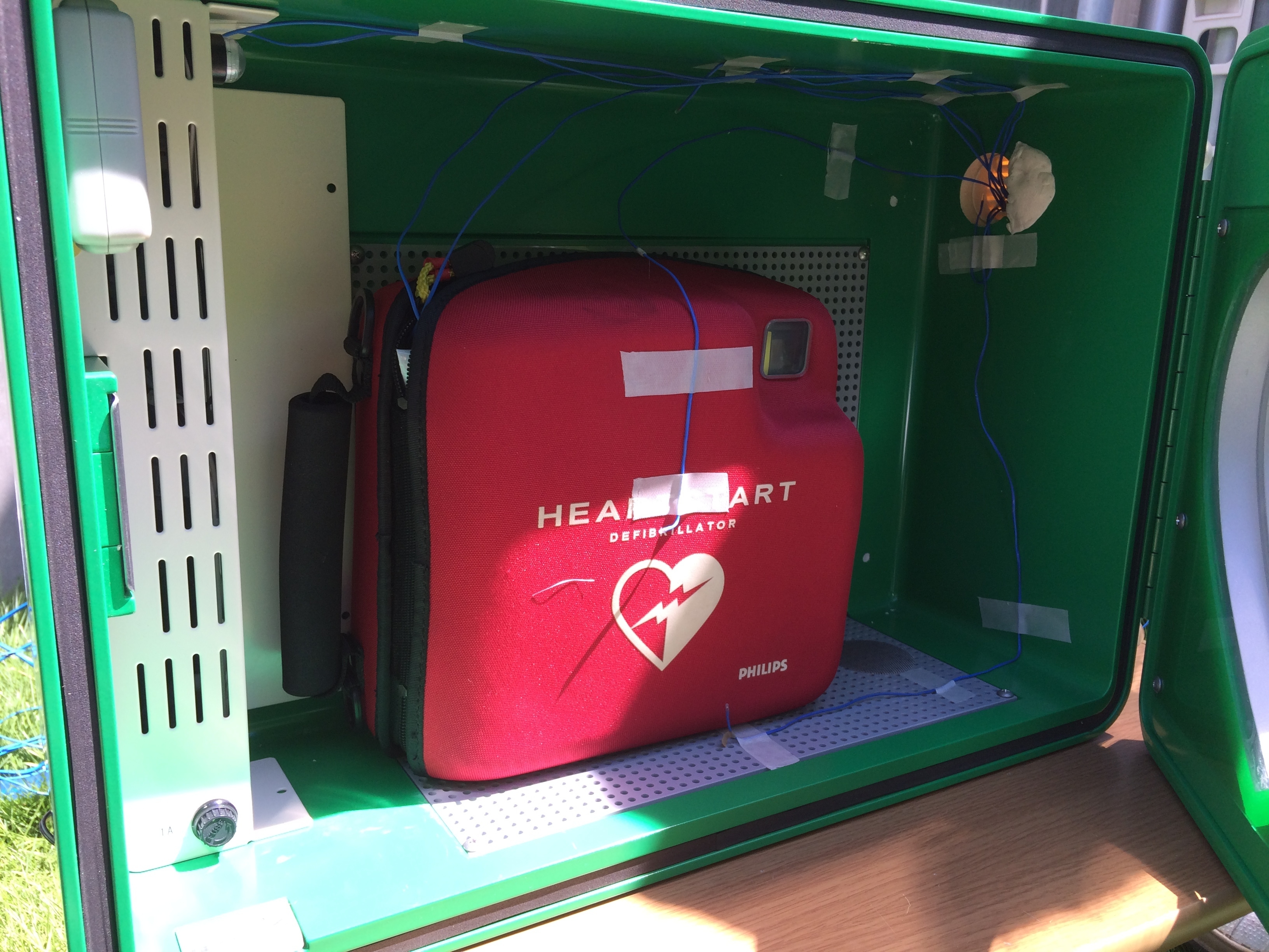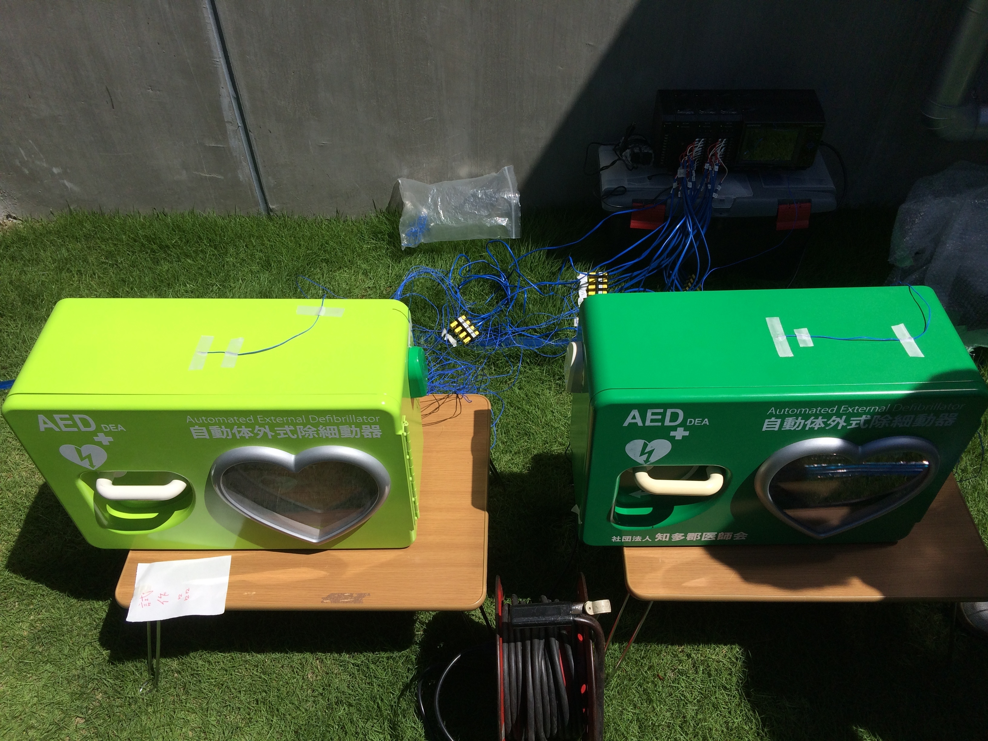 AED(自動体外式除細動器)の主なメーカーの動作保証環境温度は50度以下であり、直射日光の当る屋外では、収納ケース内の温度が高温になる事から設置は困難とされていました。