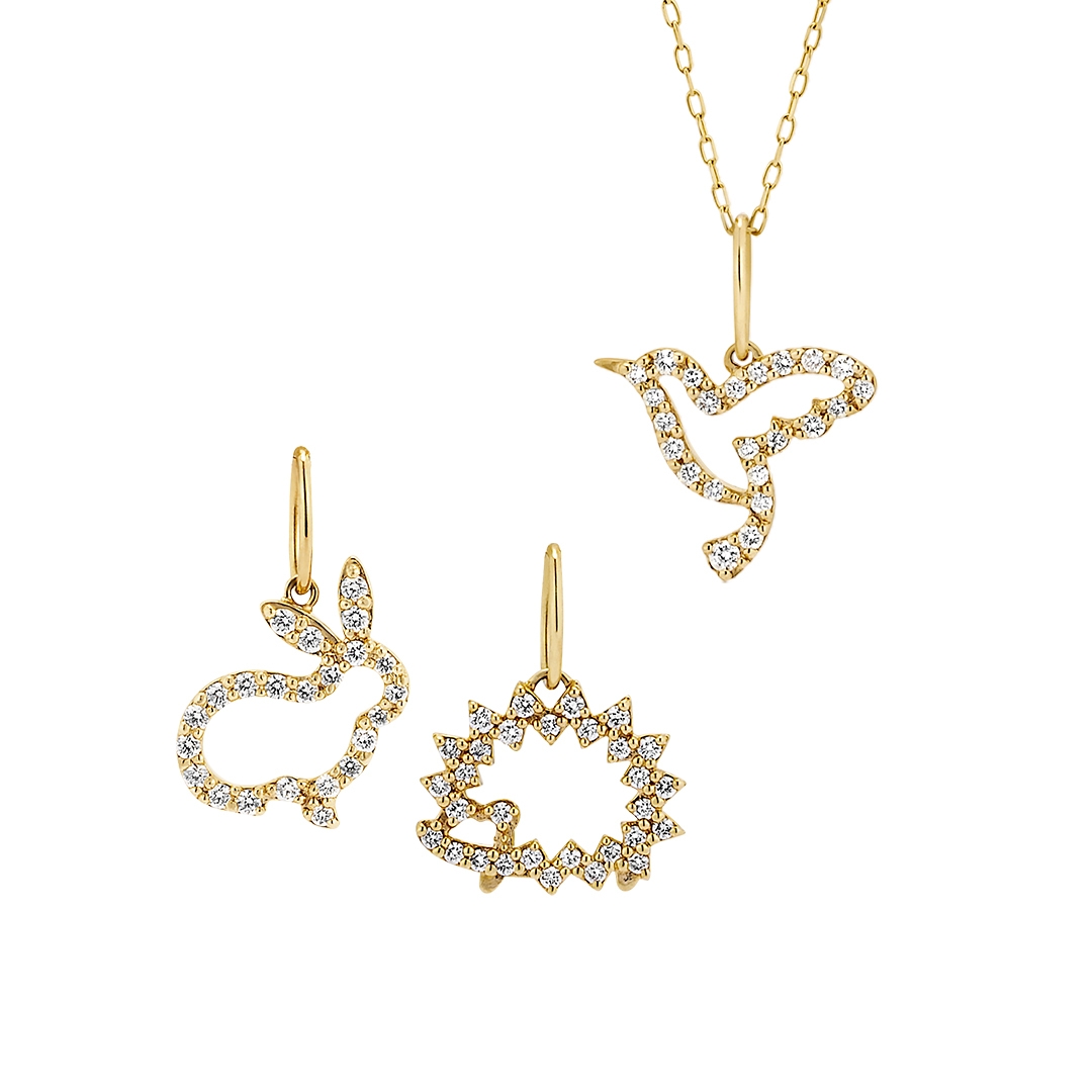 K10YG ネックレスチェーン(50cm) 17,600円、K10YG ダイヤモンド チャーム 【小鳥】 67,100円(※2025年1月1日以降 74,800円)、K10YG ダイヤモンド チャーム 【犬】 74,800円(※2025年1月1日以降 81,400円)、K10YG ダイヤモンド チャーム 【ネコ】 69,300円(※2025年1月1日以降 77,000円)、K10YG ダイヤモンド チャーム 【うさぎ】 69,300円(※2025年1月1日以降 78,100円)、K10YG ダイヤモンド チャーム 【ハリネズミ】 69,300円(※2025年1月1日以降 78,100円)