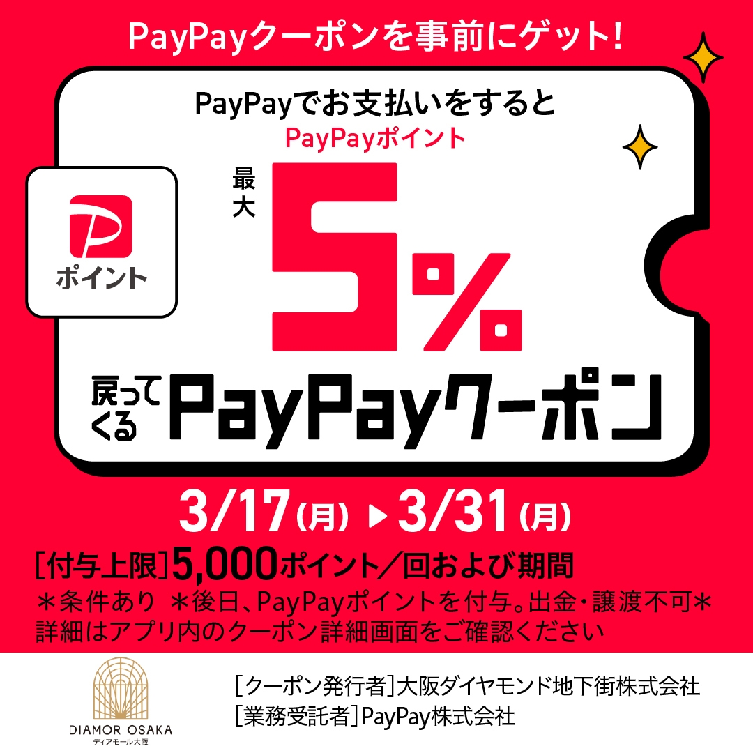 期間中、ディアモール大阪でのお買い物の際にPayPayでお支払いいただくとPayPayポイントが最大5%戻ってくるキャンペーンを開催!この機会に、春からの新生活に向けてディアモール大阪でのお買い物をお楽しみください!