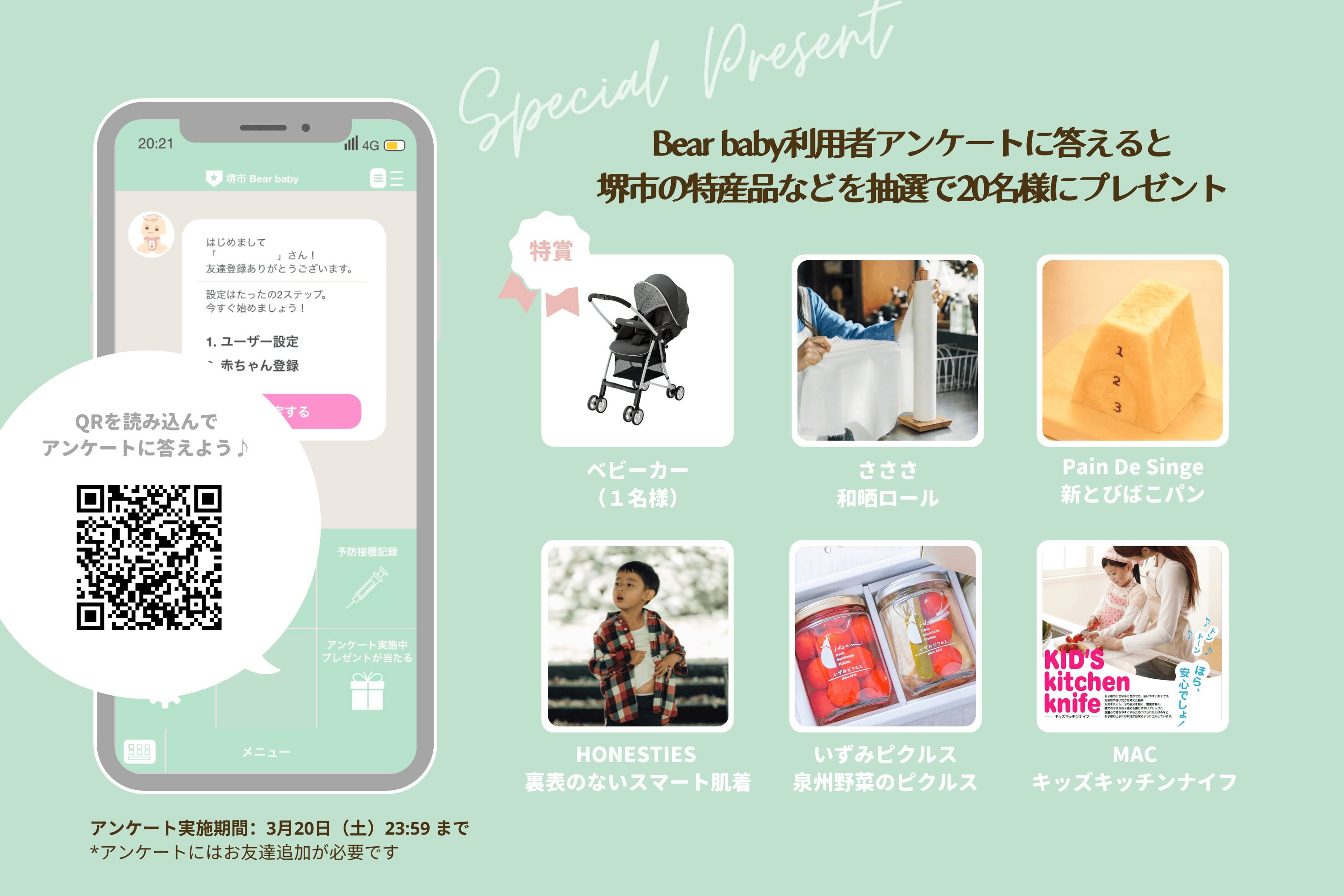 ■利用者アンケートに答えると子育て世代に嬉しい堺市の特産品が抽選で当たる