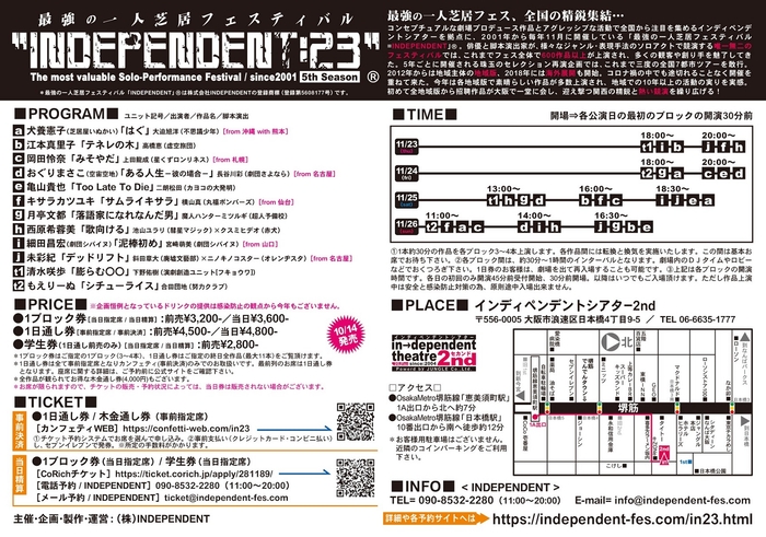 株式会社INDEPENDENT(代表:相内 唯史)主催、『INDEPENDENT:23』が2023年11月23日 (木・祝) ~2023年11月26日 (日)にインディペンデントシアター2nd(大阪府大阪市浪速区日本橋4丁目9-5インディペンデントシアタ-2nd)にて上演されます。