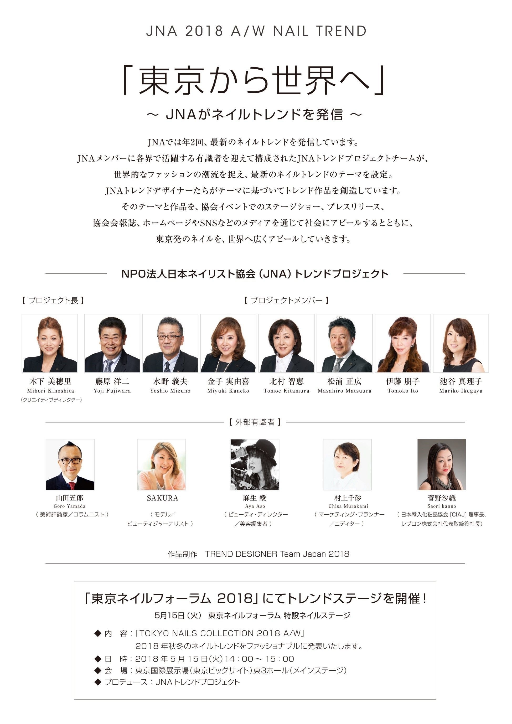 「東京から世界へ」をスローガンに、JNAメンバーに各界で活躍する有識者を迎えて構成されたプロジェクトで、そのテーマと作品を、協会イベントでのショーステージ、プレスリリース、協会会報誌、ホームページやSNSなどのメディアを通じて社会にアピールするととともに、東京発のネイルを、そして、日本のネイル技術を、世界へ広くアピールしています。