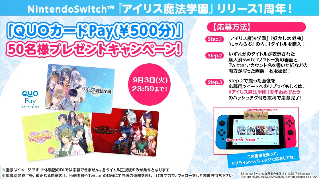 豪華声優出演・フルボイスの乙女ゲーム3タイトルを33%OFFで提供する期間限定セールに加え、デジマースの乙女ゲームを購入したユーザー様限定で『アイリス魔法学園』『妖かし恋戯曲』『にゃんらぶ』のオリジナルデザインのデジタルギフト「QUOカードPay(¥500分)」が50名様に当たるTwitterキャンペーンや、女性向けゲーム専門店“ステラワース”での来店者限定プレゼントキャンペーンを併催致します。