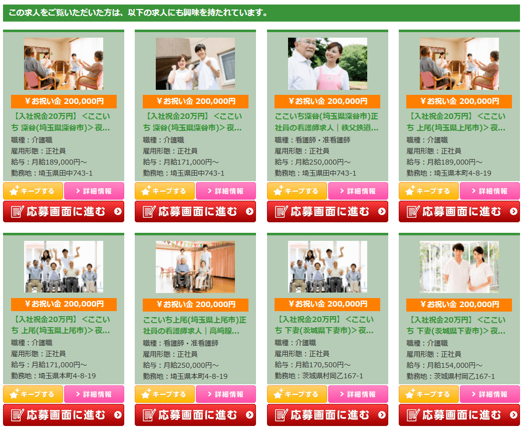 「特別養護老人ホーム」、「介護老人保健施設」、「有料老人ホーム」、「グループホーム」、「デイサービス」、「病院・その他」等の各業態別に求人をワンクリックで表示できます。