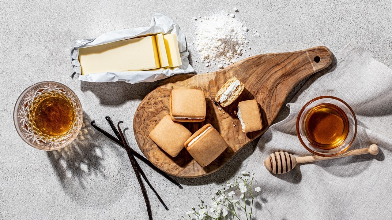 こだわりのビスケットには、厳選した小麦と発酵バターを使用し、香り高いはちみつを配合することにより素材の味を引き出し、ほろりとほどける食感の口どけで上品に仕上げています。