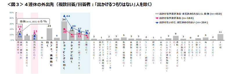 外出先は、「ショッピング」、「カフェ・食事処」、「ドライブ」<図3>。