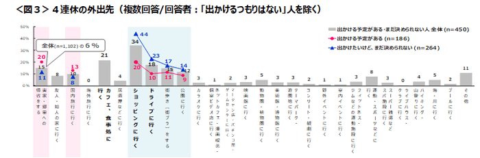 【出かける予定がある人】は「帰省」や「国内旅行」といった予約が伴いやすい外出先へ、【まだ決められない人】は出かけるとしても予約不要な「ショッピング」や「ドライブ」。