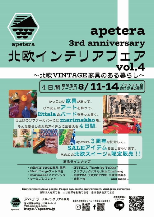 インテリア・家具のセレクトショップ apetera/アペテラが、8/11~14に北欧をテーマにした4日間の期間限定ショップをブランチ仙台(仙台市泉区)でオープン。
