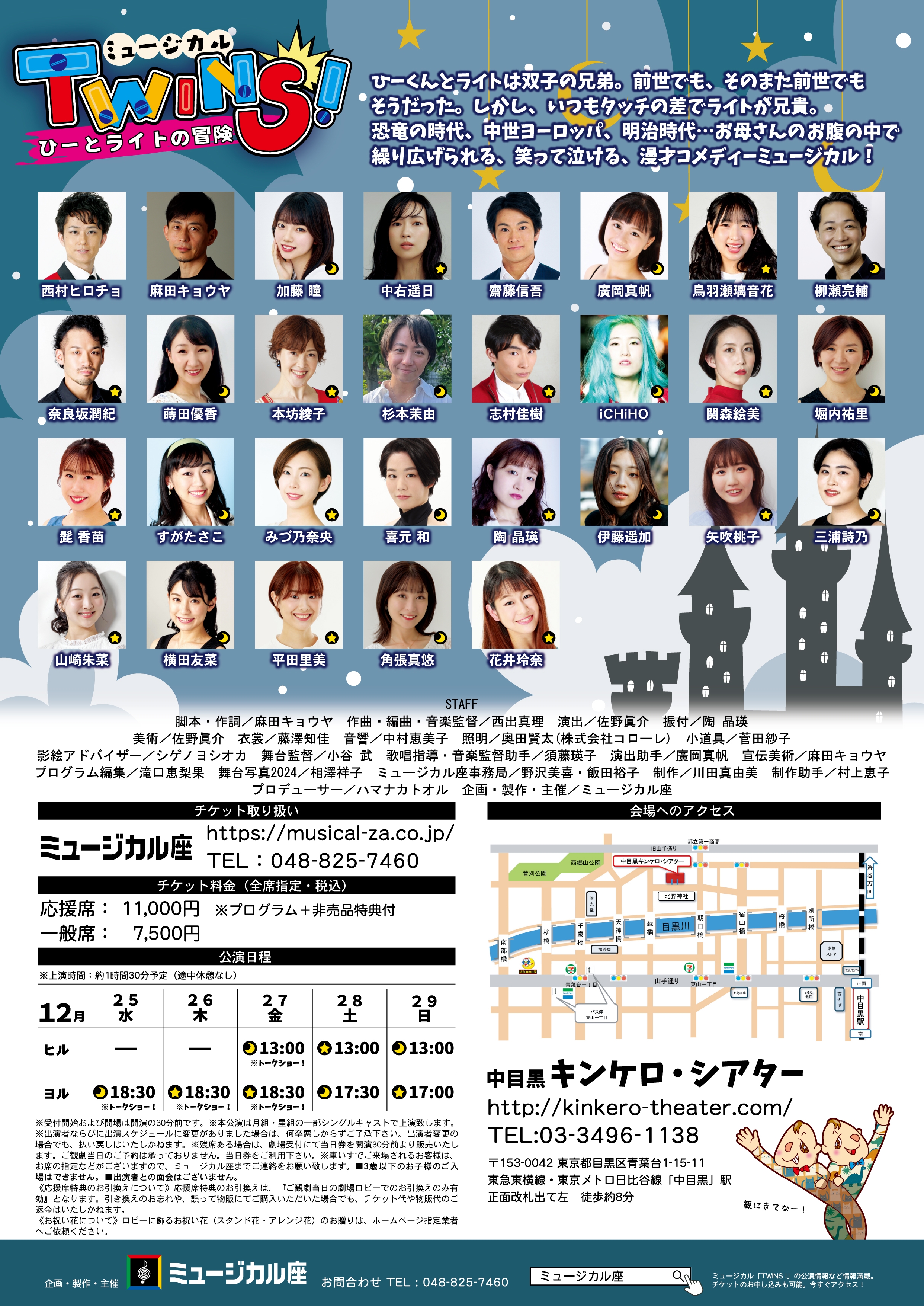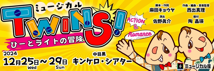 ミュージカル座『TWINS!~ひーとライトの冒険~』が2024年12月25日 (水) 〜 2024年12月29日 (日)に中目黒キンケロ・シアター(東京都 目黒区 青葉台 1-15-11)にて上演されます。チケットはカンフェティ(運営:ロングランプランニング株式会社、東京都新宿区、代表取締役:榑松 大剛)にて発売中です。
