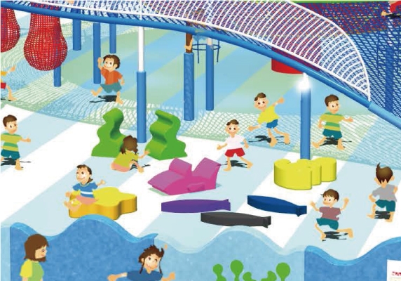 キッズパラダイス内に新たに設置される「南の島の大冒険」は、温かな南の海とそこに浮かぶ火山島をイメージした巨大な屋内アスレチック遊具です。